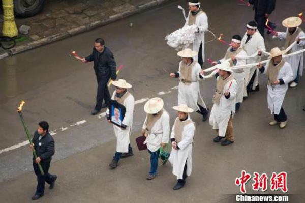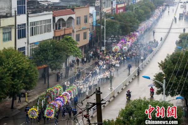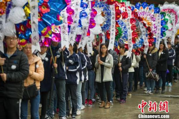中新网河池3月15日电 “咣咣咣”,响亮的锣声回荡在桂西北瑶乡都安县城清晨的上空。15日,是广西河池市都安县高级中学校长莫振高出殡的日子。上千名各界民众或手握蜡烛或手举花圈,有序地走在湿漉漉的街道上,队伍绵延数百米长,送别人们心目中的大好人——莫振高。