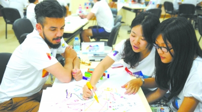 在中美青年创客大赛上,两国青年讨论创意。