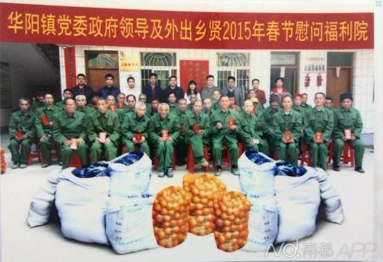 华阳福利院古姓院长今早也告诉南都记者,春节期间,镇上十余名乡贤在镇政府工作人员的陪同下慰问孤寡老人,期间还送来物资。“合影时人比较多,福利院门坪又狭窄,没办法在正中间堆放物资合照,故而只先拍人。”古院长透露,“每年都这样。”