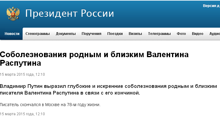 3月15日:普京向俄已故作家瓦连京·拉斯普京的亲人表达哀痛之情。(克里姆林宫官网截图)