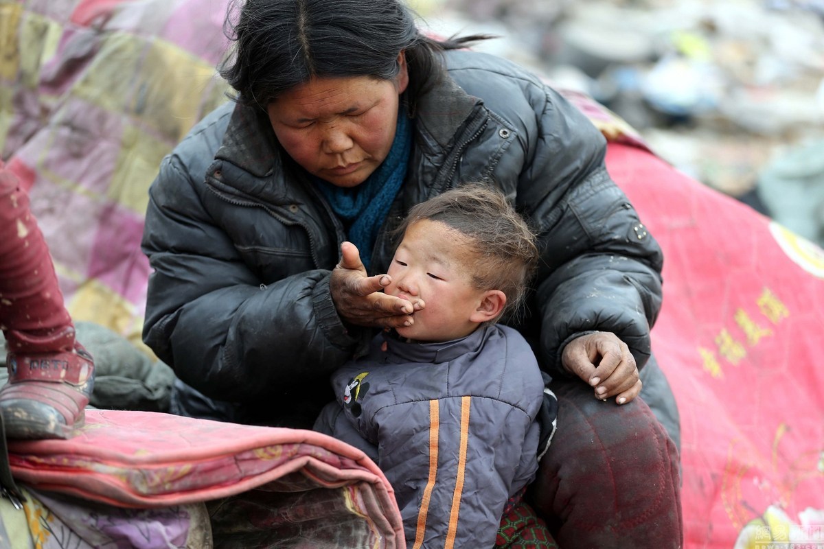 孩子一个接一个的出生,让这个家里的经济更是雪上加霜。由于没有文化,杨松事说自己都不知道给孩子上户口。没有户口自然连学也上不成。图为2015年3月10日,山西省运城市,杨园园的母亲正在喂最小的一个孩子杨四满吃东西,虽然智障,但是母亲的天性让她照顾着自己的孩子。