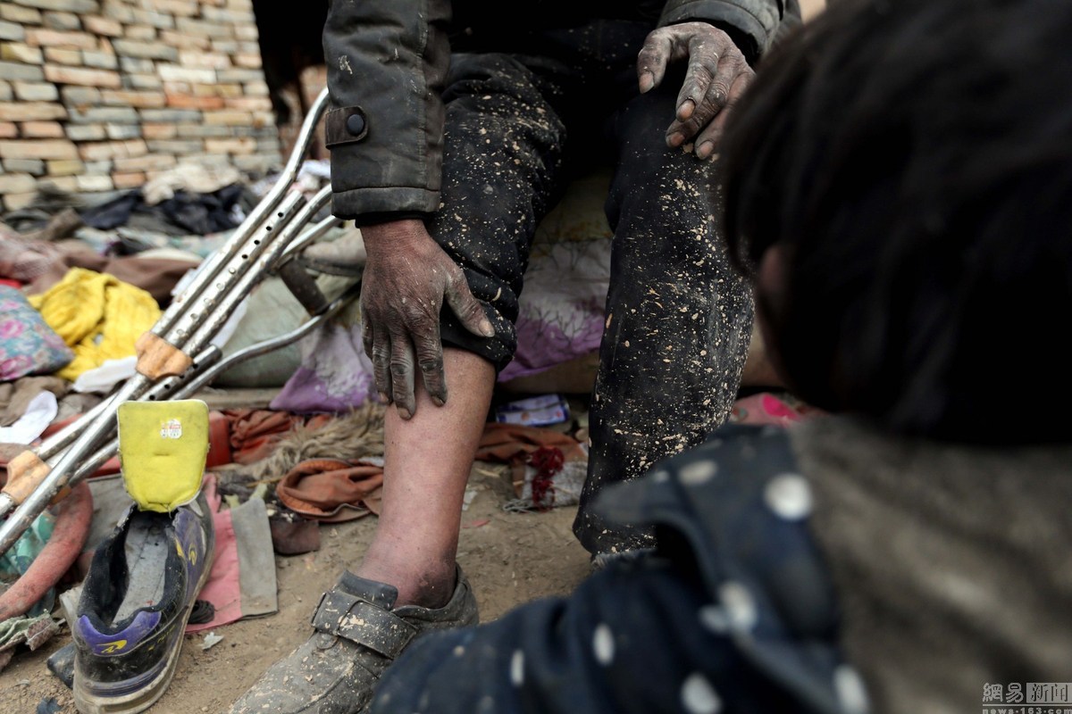 2015年3月10日,山西省运城市,年仅8岁的杨甜甜抚摸着父亲受伤的腿说,自己好难受。