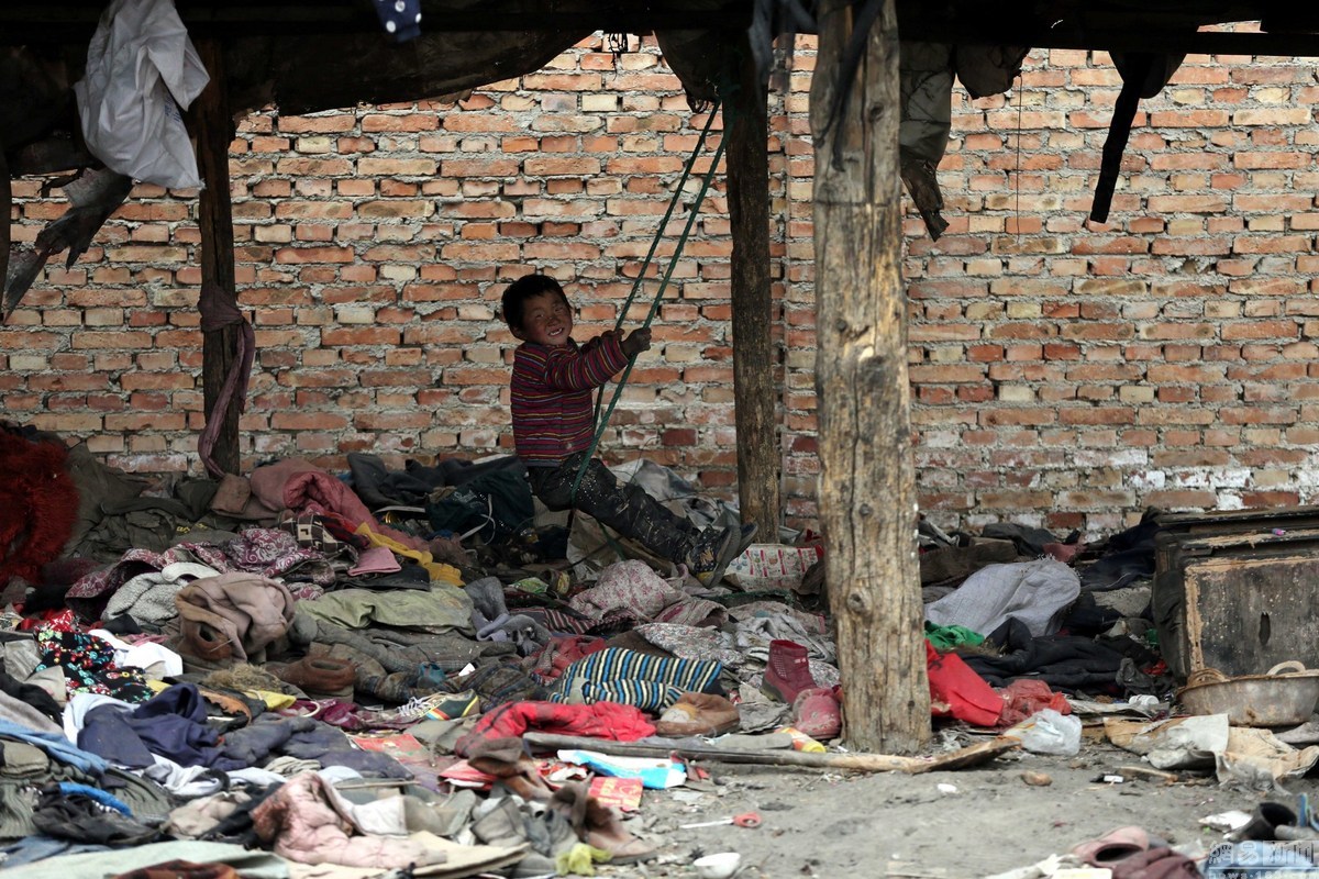 2015年3月10日,山西省运城市,杨满满在荡秋千,这个秋千是父亲用绳子系在房梁上做的秋千。