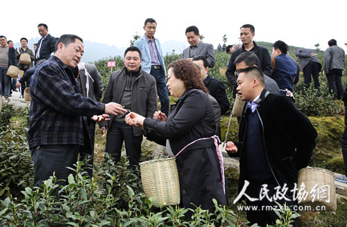 3月16日,四川省达州市政协组织部分政协委员深入大竹县团坝镇调研白茶产业发展情况,并提出有针对性的意见建议。图为委员们现场体验采茶。 (王梦 摄)