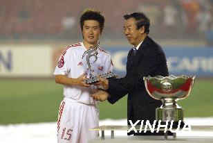 资料图:参加2004年亚洲杯决赛的肇俊哲(左)。图片来源:新华网。 新华社记者 孟永民摄