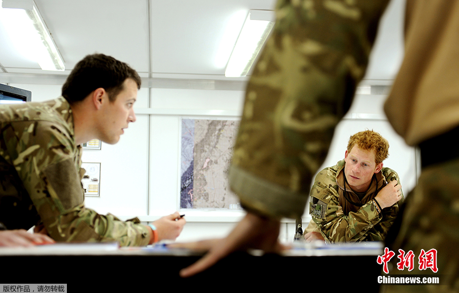 当地时间2012年10月31日,阿富汗南部的英军营地,哈里王子参加一次任务简报,制定飞行路线。