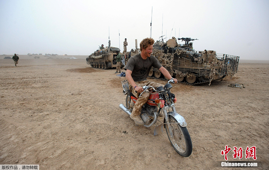 图为当地时间2008年2月21日,阿富汗南部赫尔曼德省,哈里王子在沙漠里发现了一台被人遗弃的摩托车,开心地骑了上去。