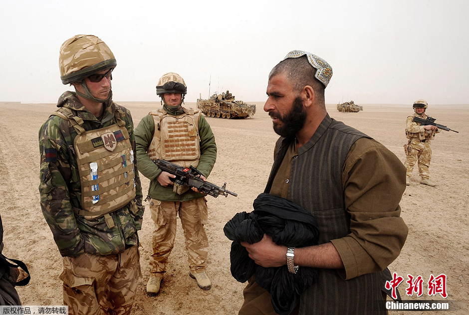 图为当地时间2008年2月21日,阿富汗南部赫尔曼德省,哈里在一名阿富汗翻译的帮助下,指导一名阿富汗民众绕开英军的警备区。