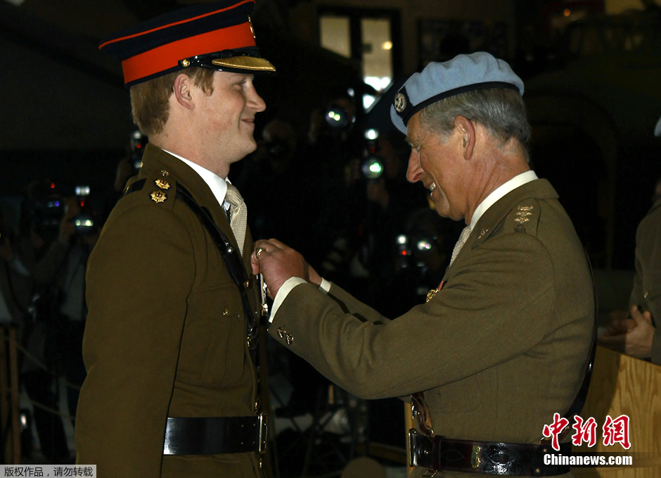 当地时间2010年3月7日,英国南部的陆军航空兵中心,哈里王子接受父亲查尔斯王储向他颁布的飞行勋章,成为一名英国皇家陆军航空兵飞行员。