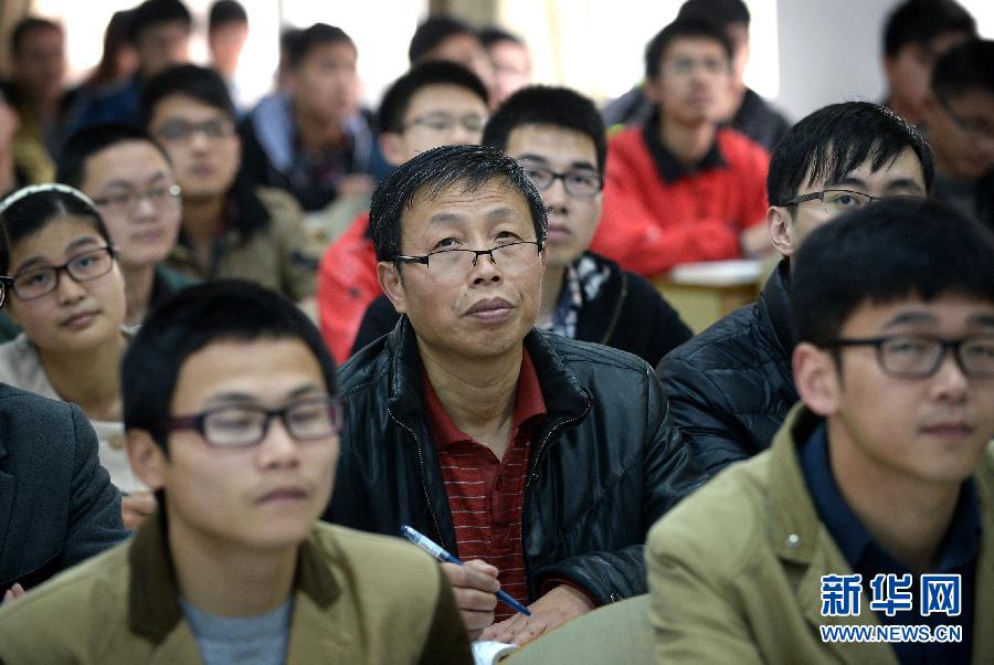 52岁的淦菊保是江西中医药大学中西医结合临床专业的一名学生,被同学们称为“淦叔”。年轻时的淦菊保在乳品厂上过班,开过公司,对医学的热爱让他重新回到校园。2008年,为激励两个儿子用功读书,淦菊保与大儿子一起参加高考。尽管分数达到专科录取线,但他没有填报志愿。2009年,他再次同小儿子一起踏入高考考场,最终被江西中医药高等专科学校录取。“学爸”成为一名高龄大学生。 2012年,淦菊保通过专升本考入江西中医药大学,成为校园里的励志大叔。2014年,淦菊保参加考研,成为南昌报考点里年龄最大的考生,最终因为英语差3分而失去机会。经过一年复习,淦菊保的2015年考研初试成绩超出国家线11分。“如果考研复试顺利,我还想接着考博。在考试中激励自己学习,不断吸收新知识、尝试新方法是学习的乐趣所在。” 淦菊保说,“希望有生之年,在学医的道路上能走得更远。” 新华社记者万象 摄
