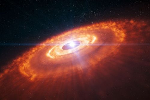 当地时间2014年11月6日,欧洲南方天文台发布金牛座及其原行星盘图片。ALMA拍摄的最清晰影像,展示了450光年以外一颗年龄不超过100万年的恒星周围,行星正在尘埃气体盘中形成的场景。