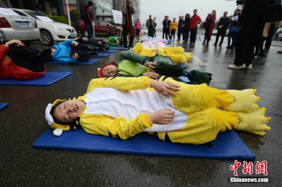 3月20日,世界睡眠日前夕,被誉为中国“睡眠先生”的唐堂带领众多市民来到长沙街头进行“睡大街”公益行为艺术展示。 杨华峰 摄