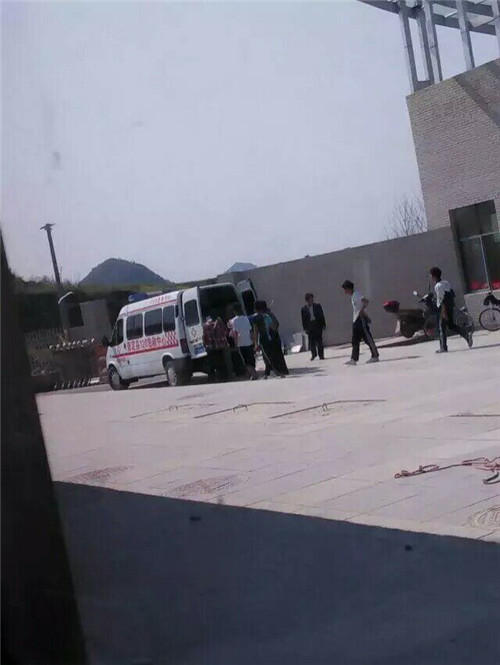 从18日起,便有学生陆续出现呕吐腹泻、四肢乏力等症状。救护车将部分学生分别送往普定县人民医院和县中医院。据张华回忆,19日晚,有同学担心耽误课程带病上课,晚自习后再次有部分同学出现肚痛、抽搐等症状。有的教师甚至骑自行车将学生送往医院。图为在学校大门口,学生在送食物中毒的同学上救护车。