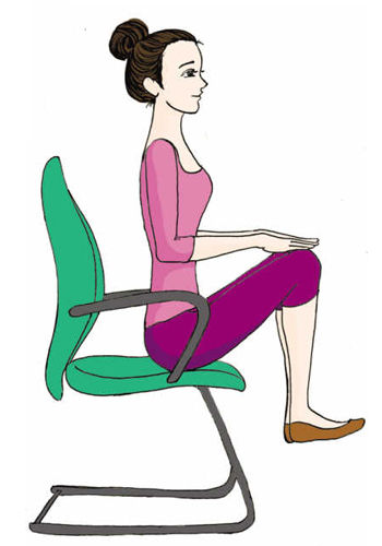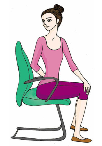 5. 坐姿抬腿。坐在椅子边缘,双手抓住扶手;膝盖并拢,缓慢地向上抬,重复15次。可以增加难度:在做最后一次时,保持静止姿势30秒钟。预计燃烧热量:30卡路里。