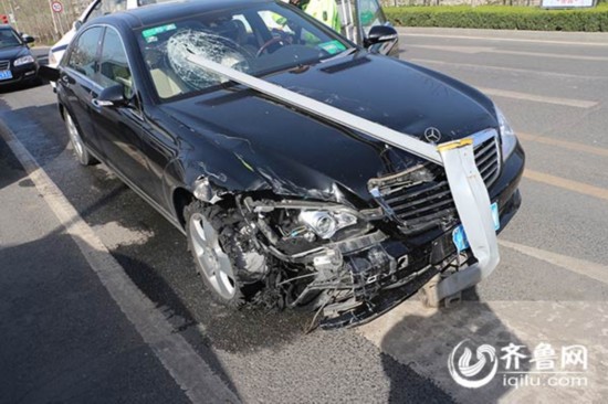 车辆的右前轮胎已经完全磨光,车辆右前侧也已经面部全非,幸而副驾驶位置没有乘坐人员,否则后果不堪设想。随后民警对其进行了抽血检验,目前案件正在进一步调查。图为事故轿车的右前方已完全变形。