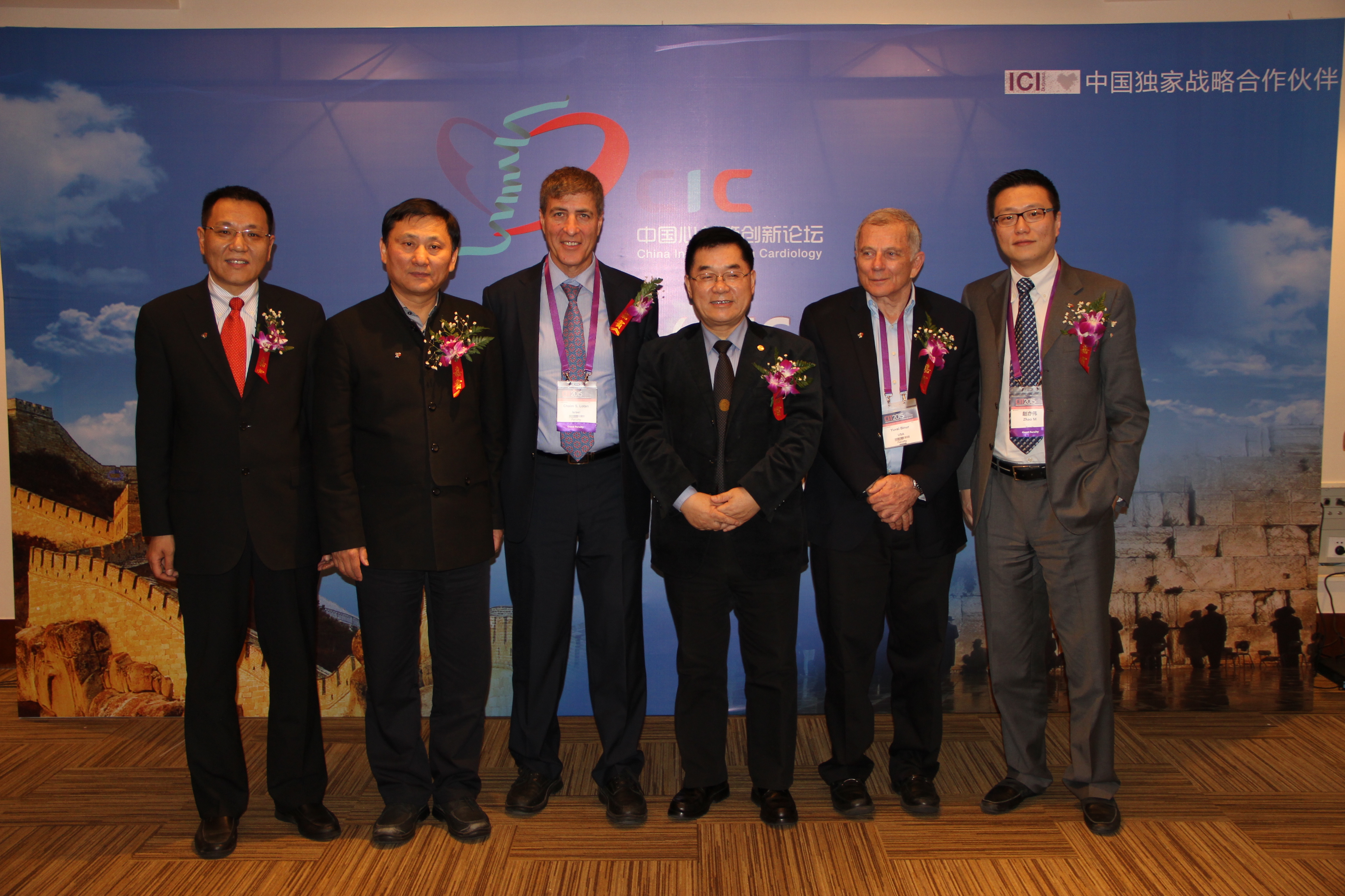 中国心血管创新论坛(CIC)新闻发布会上,全国政协委员、北京大学第一医院霍勇(左二),南京医科大学第一附属医院心内科主任孔祥清,中华医学会心电生理和起搏分会主任委员、武汉大学人民医院黄从新(左四)与来自以色列的专家合影