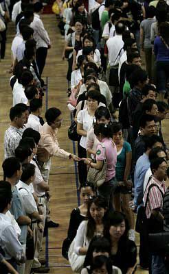 3000余位白领青年凭借手中的号码在卢湾体育馆排队相亲,男青年排列成队,女青年走完整个队伍,这个过程持续了1小时。