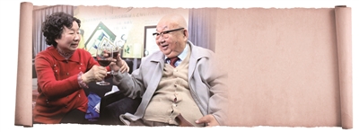 为了庆典,主办方还准备了红酒,两位老人现场喝起了交杯酒。“60年前结婚时没喝,今天倒补上了。”60年恩爱,却是第一次在媒体镜头前喝交杯酒,陈廉方有些不好意思。