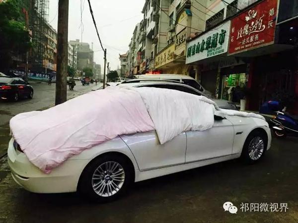 永州祁阳街头,盖着被子的宝马车。供图/网友