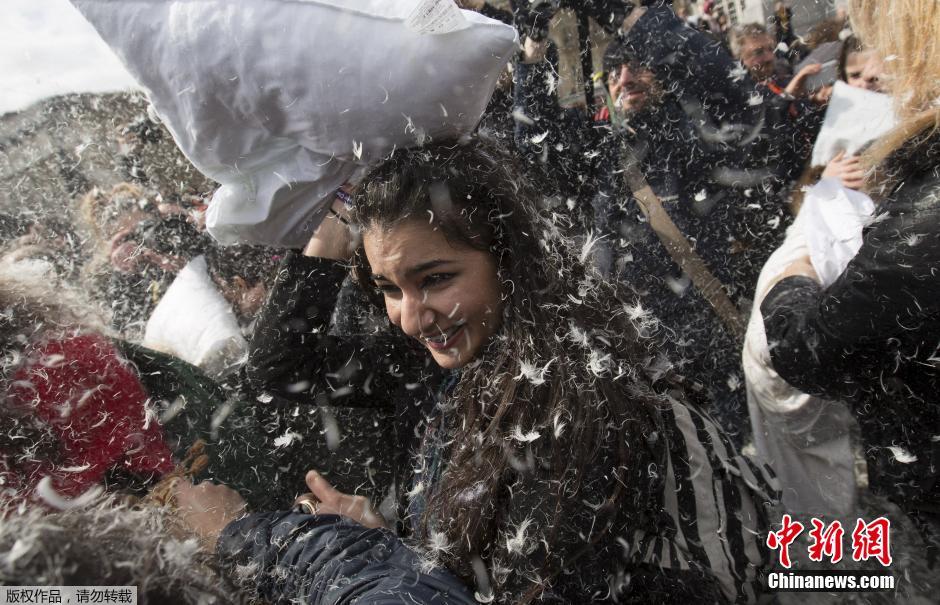 当地时间4月4日,2015年枕头大战在英国伦敦特拉法加广场举行。