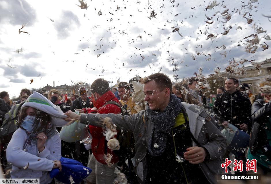 当地时间4月4日,2015年枕头大战在匈牙利布达佩斯举行。