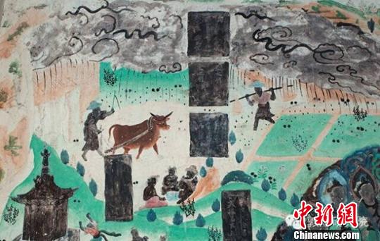 莫高窟第23窟北壁画面上乌云迷漫,细雨沥沥,一位农夫挥鞭策牛耕地,一位农夫肩挑庄稼。田头上坐着一家老少?;嬉彩欠鸾叹浠纠词俏锲降确鸹?,犹如甘露时雨,普润万物。但同样在宗教因素之外,这也是一幅难得的古代“雨中春耕图”。