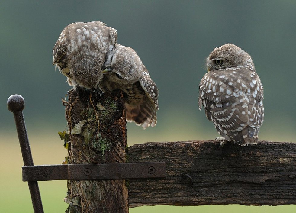 它的兄弟一开始将头扭了过去,对它有点儿嫌弃。最后,这只小猫头鹰终于成功钻到了兄弟的翅膀底下,三只小猫头鹰抱成一团,看上去一派温馨景象。