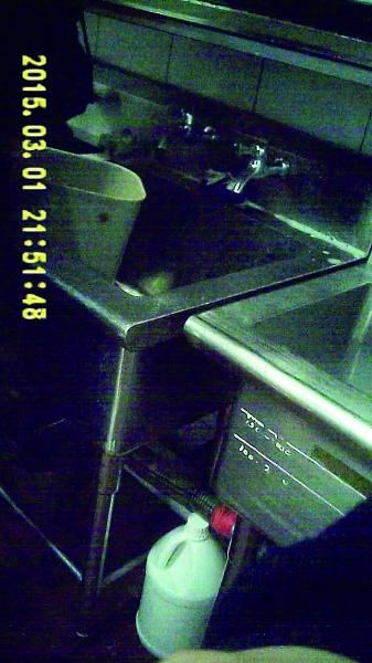 3月1日,晚上9点半闭店后,一员工将垃圾车推了进来开始清洗,她直接把垃圾桶坐进用来洗碗的左侧第二个池子中,拿起一桶清洁剂倒了点进去,然后用清洁布擦起垃圾桶来。两个垃圾桶洗完后,又放回到垃圾车上,推着垃圾车离开。