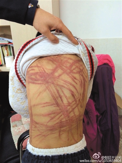南京警方查明,9岁男童小磊被养母虐待。全身多处有红肿痕迹。网络截图