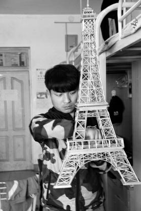 华商报宝鸡讯(记者宋秉琴 实习生杨蓓蕾)女友一直很向往去巴黎看埃菲尔铁塔,宝鸡文理学院大三男生陈旭辉就用3000支竹签搭建成了90厘米高的一个竹签版的埃菲尔铁塔。