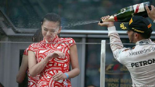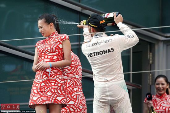 F1车手开香槟喷中国礼仪小姐 德媒:引性暗示争议