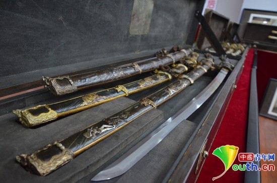 图为展览中的岸信介家持用刀,上刻浮世绘春宫图。见习记者 苏贺 摄