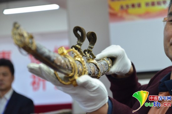 工作人员展示参展军刀。见习记者 苏贺 摄