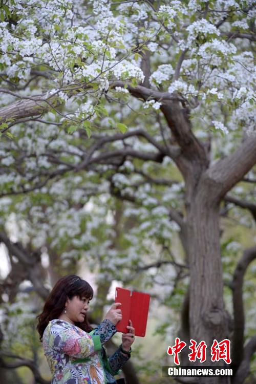 图为游客在库尔勒市市区梨园里拍照游玩。 确·胡热 摄