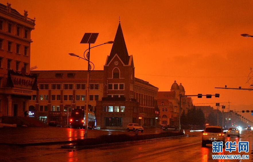 这是笼罩在红色中的阿尔山市街头(4月15日摄)。当日下午2点左右,内蒙古阿尔山市出现红色尘霾笼罩天空,并下起小雨,致使当地能见度极低,宛如黄昏。约1小时后,天空逐步恢复正常?! ⌒禄缂钦?任军川 摄