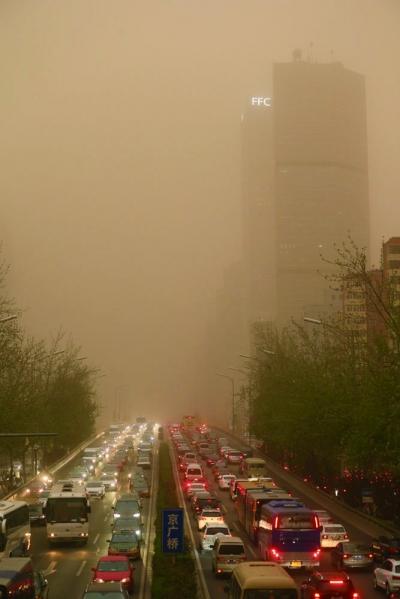 盘古大厦“隐身”了、国贸三期“隐身”了……昨天傍晚,在强风、冷空气及“外来沙”的联袂合作下,京城遭遇了13年来最强沙尘暴“袭击”,城六区PM10指数均“爆表”,持续三个小时左右。