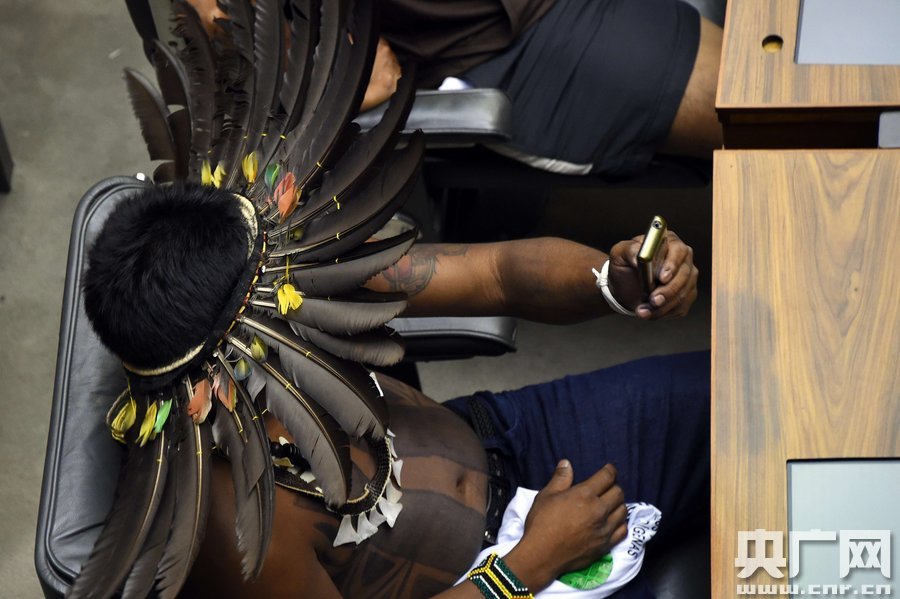 当地时间2015年4月16日,巴西巴西利亚,巴西原住民参加国民议会。