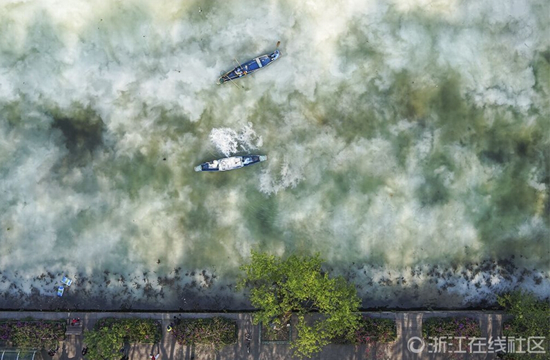 西湖景区开始清理荷塘。从天上俯瞰撒过漂白粉的荷塘,船儿犹如在云中穿行。