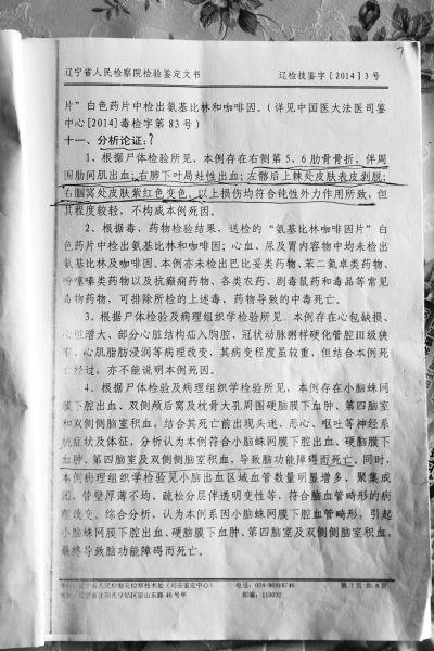 宋长芬申请进行尸检。法晚记者看到落款为辽宁省检察院出具的鉴定文书内写明,刘宝龙“因小脑蛛网膜下腔血管畸形,引起小脑蛛网膜下腔出血、硬脑膜下血肿、第四脑室及双侧侧脑室积血,最终导致脑功能障碍而死亡”。