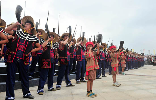 黎族汉子吹响欢迎嘉宾的角号。