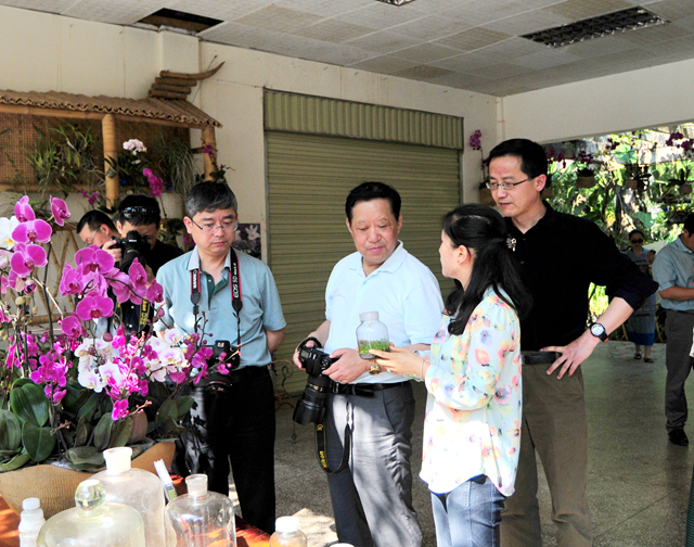 西双版纳热带植物园副主任胡华斌陪同刘晓峰一行先后参观了百花园、能源植物园、奇花异卉园、棕榈园、荫生植物园、名人名树园、科研中心和藤本植物园等植物专类园区和科研科普设施。