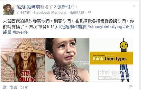 中新网4月23日电 据台湾“中国时报”报道,日前,台湾女艺人杨又颖自杀身亡,她在遗书中提及工作中遭到欺辱,被疑是轻生原因。今日,范玮琪在社交网站上发文反对网络欺辱。