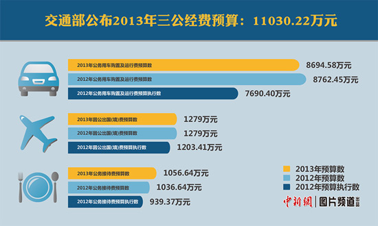 2013年交通运输部“三公经费”财政拨款预算数为11030.22万元。制图:任芳