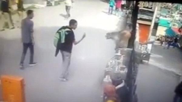 4月26日消息,印度西姆拉(Shimla)地区监控器拍下的一段视频显示,这名少年在向猴子做出竖中指的侮辱性动作后,激起猴子的激烈反应,被猴子飞脚踹脸后打翻在地。