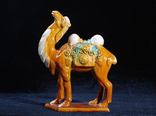 丝绸之路沿线基本上是沙漠,享有“沙漠之舟”美誉的骆驼,成为丝绸之路上必不可少的交通运输工具,以其默默无声的千年负载,赢得了中原和中亚、西亚乃至阿拉伯商人的敬重。所以,骆驼成为唐三彩中重要的造型表现形式。唐三彩绵绵不断地受到丝绸之路的影响,也体现着经济文化交流影响着艺术的发展趋势。
