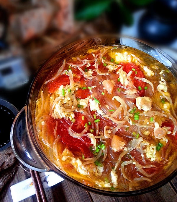5. 粉丝在烹调前已经用水浸泡涨发;放入到炒好的西红柿中。用水壶加入2碗水煮开。