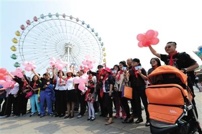 昨日,在网上报名乘坐摩天轮游览的游客向摩天轮告别。今日,石景山游乐园摩天轮将运营最后一天。新京报记者 吴江 摄