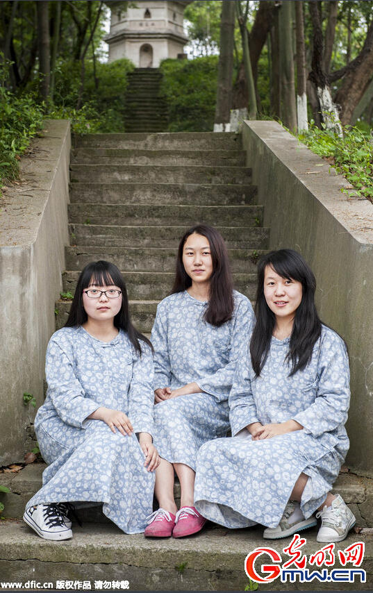 4月28日,浙江台州,温岭市新河中学的高三学生,穿着改版旗袍,拍摄毕业照。这种旗袍一改传统旗袍修身束体的式样,配上蓝色碎花仿佛床单裹在身上。