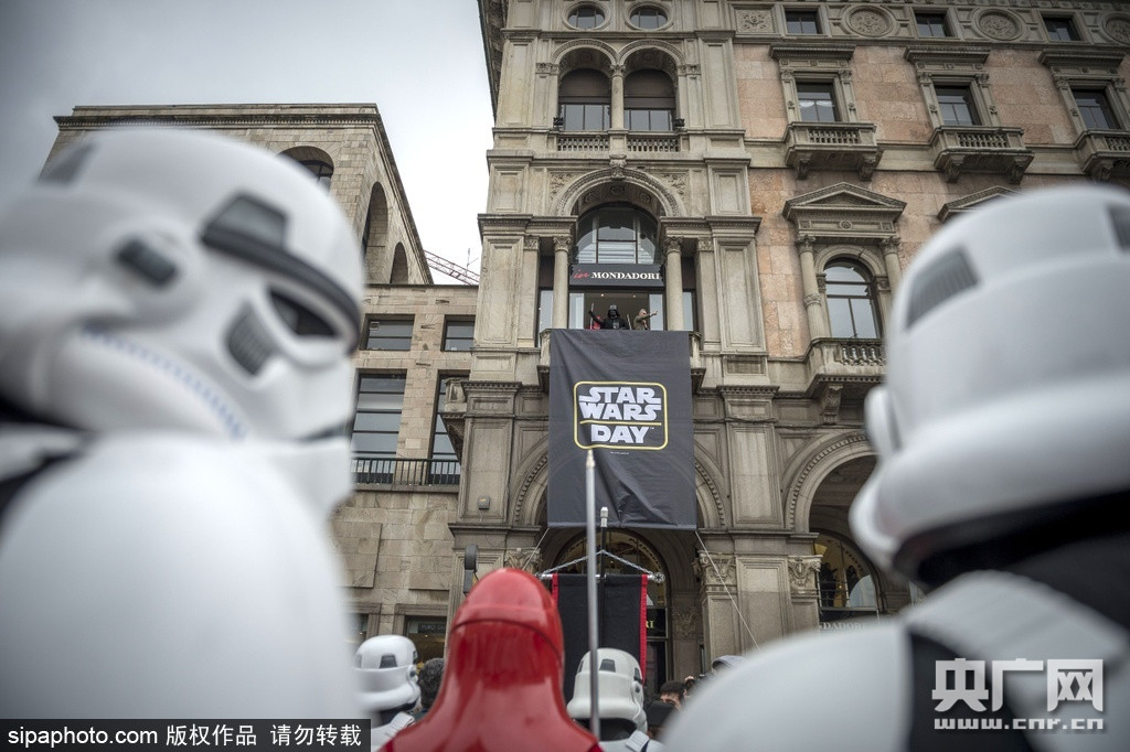 当地时间2015年5月3日,意大利米兰,当日是“星球大战日”,星战粉丝齐聚米兰庆祝。电影《星球大战》系列有一句经典台词:“May the force be with you”,跟“May the Fourth be with you”发音相近,因此5月4日被粉丝定为“星球大战日”。