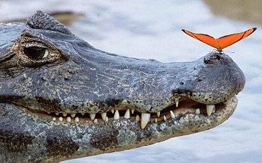 据外媒报道,日前摄影师拍摄到一只色彩艳丽的蝴蝶,停在了一条鳄鱼的头上歇脚,这只鳄鱼很平静,它只是微微瞥了一眼蝴蝶。
